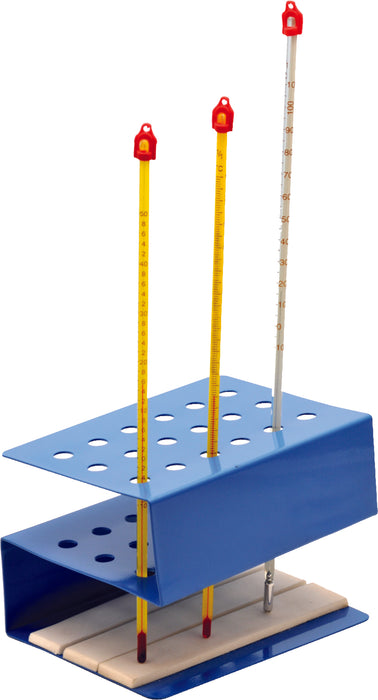 Sheet metal. Supports 18 mm thermometers. Size 165 x 120 x 125 mm Sheet metal. Supports 18 mm thermometers. Baseplate has foam rubber cushions to protect thermometer bulbs. Size 165 x 120 x 125 mm