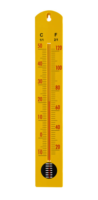 Wall thermometer mounted on plastic moulded base, with screen printed markings and figures. Range -10° to 50° C x 1° C and 20° to 120° F x 2° F. Red / Blue spirit filled. Measures 2.4" wide and 15.75" long.