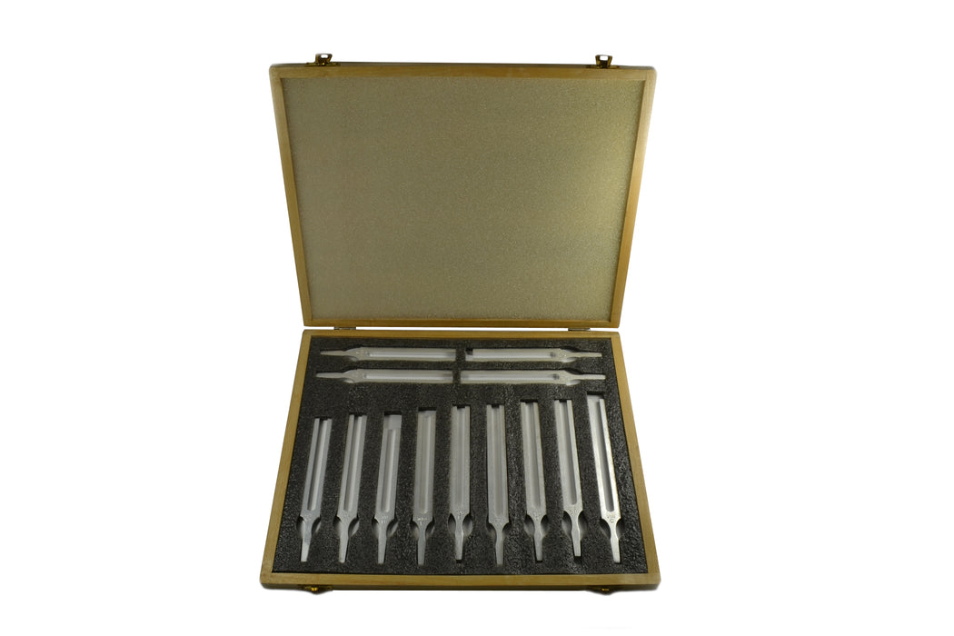 Contains 13 plain shank tuning forks with frequencies marked from C(236) to C(512). Essential for studying sound wave physics. Contains: G# 406 F1 362 B 480 F 341.3 E 320 C1 271 D 288 D# 304.4 C 256 A 426.6 A# 456 G 384 C 512