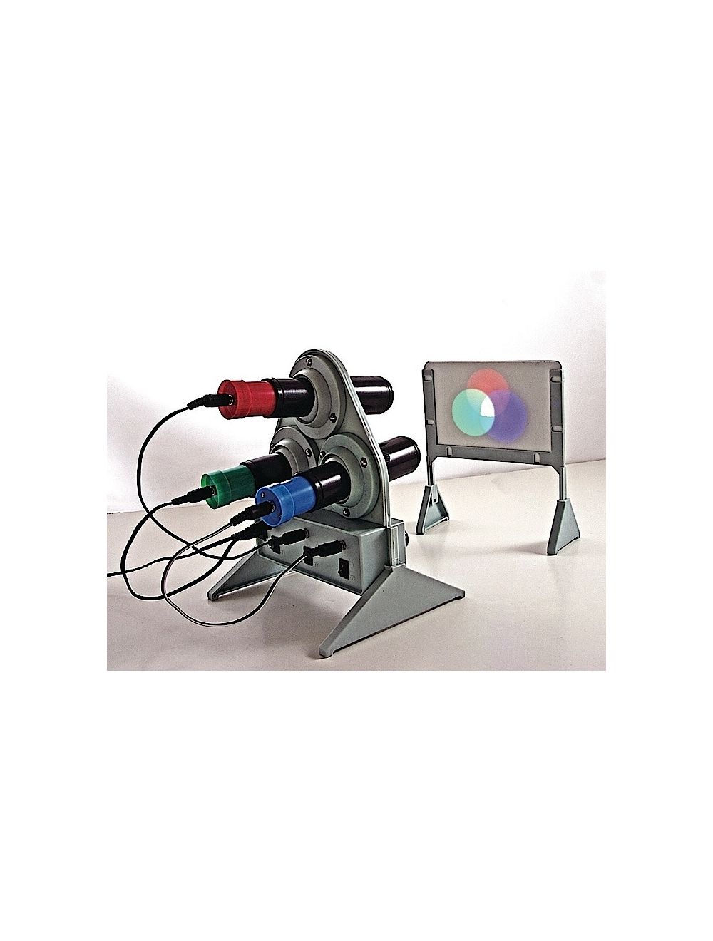 A compact and economical color-mixing apparatus, this updated version of the classic three-color light projector utilizes three low-voltage, high-power LEDs to project easily seen red, green, and blue light onto a white screen. The projector mounting allows the beam angles to be adjusted to vary the overlap of the three colored images. The intensity of each LED can be adjusted separately by a potentiometer to produce a convincing white light or various shades of mixed colors. In a darkened room, colored shadows can also be explored. The set includes a wall-mount power supply and activity guide.