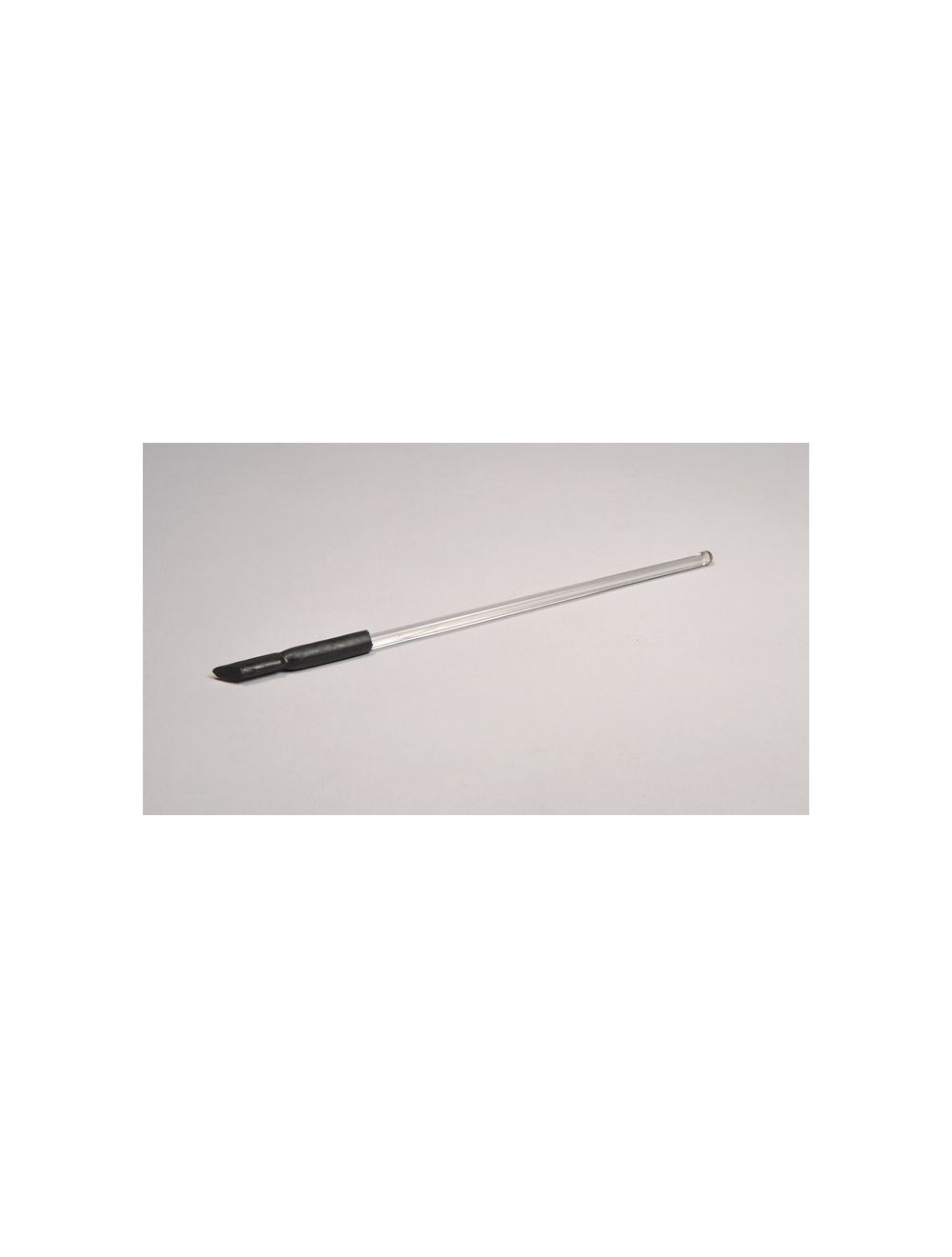 A rubber policeman attached to a glass rod facilitates scraping and mixing. The stirring rods are made of soft flint glass, with both ends being fire-polished and rounded. The policeman is made from pure silicone rubber, with no additional components such as sulfur added. The rubber is not vulcanized. It comes pre-assembled.