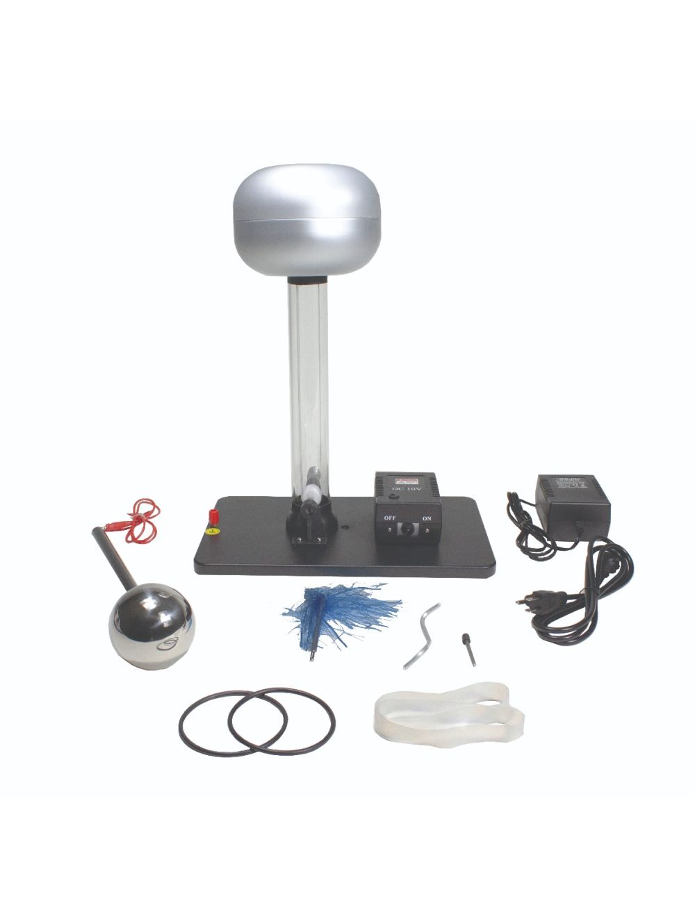 This excellent quality electrostatic generator consists of a charge generation system, an aluminum collector sphere and an electric motor drive on a sturdy base. The charge generation system is based on a moving neoprene belt mounted on insulating rollers with metal charge transfer combs. The system is housed in a clear tube that allows for easy viewing of the moving parts. A 100,000 volt potential can be generated. Requires a 110 VAC outlet.