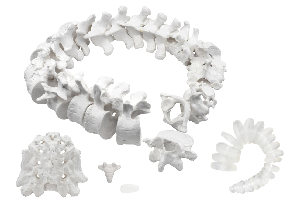 A complete set of individual spinal bones is perfect for the study of anatomy, as well as for osteopathic and chiropractic patient demonstrations. The bones are life-sized and cast from a real human skeleton, featuring realistic details, textures and bony landmarks - providing an incredible amount of realism for examining the human spine. Made of durable and sturdy plastisol polymer which is easy to clean and will hold up to years of handling. The 50-part set includes: (24) vertebrae strung in order on a nylon line; (23) intervertebral discs strung in order on a nylon line; (1) sacrum; (1) coccyx; (1) sacrococcygeal disc.