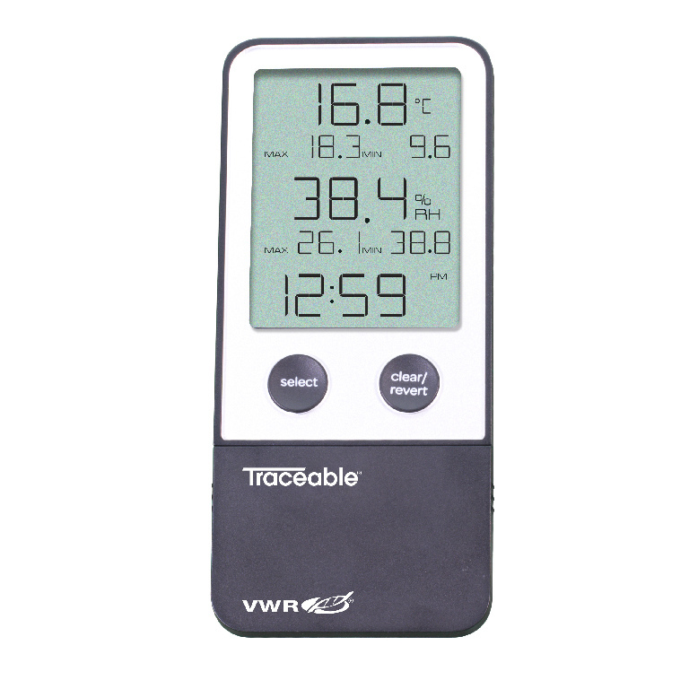 Monitor temperature, humidity, and time simultaneously, at a glance., Clock displays AM/PM or 24-hour military time to the exact minute with ±0.01% accuracy. Noting changes is easy with triple display. Internal sensors make it ideal for use in hoods, storerooms, cleanrooms, incubators, drying chambers, and environmental cabinets., 04_BodyText: Temperature range is 32.0 to 122.0°F (0.0 to 50.0°C); resolution is 0.1° and accuracy is ±1°C. Relative humidity range is 20 to 90%; resolution is 1% RH and accuracy is ±5% RH mid-range, otherwise 8%. At the touch of a button, memory recalls highest and lowest temperature and humidity readings. Permits monitoring conditions overnight, on weekends, or any time period., 05_BodyText: Traceable® Products have an individually-numbered Traceable® Certificate provided with each unit, that assures accuracy from our ISO/IEC 17025:2017(1750.01) calibration laboratory accredited by A2LA. It indicates traceability of measurements to the SI units through NIST or other recognized national measurement institutes (NMI) that are signatories to the CIPM Mutual Recognition Agreement. Each product goes through an intense vetting process before it can carry the Traceable name, thus saving you both time and money by not having to calibrate separately., 02_BulletPoint: All three parameters are displayed on screen, all the time, so you can log conditions without putting down your clipboard | Staff onboarding is a breeze with an enhanced, more intuitive user experience including large buttons, high-contrast text, and purposeful design | Reduce upkeep with boosted battery power and interior tech upgrades for higher performance | Features min/max memory, which is easily cleared at the beginning of each process | Maintain compliance; includes NIST-traceable certificate from our A2LA accredited (1750.01) calibration laboratory | Goes anywhere, whether magnetically mounted or set on the benchtop with built-in kickstand, 08_Certifications: NIST Traceable., 11_Delivery: Includes hygrometer, hook and loop tape, AAA batteries, recalibration reminder magnet, quick start guide, and Traceable® certificate., Final SAP Desc Link: 6819676, SAP Description Status: Ready, Temperature range: 0...50 °C (32...122 °F), Monitor temperature, humidity, and time simultaneously, at a glance., Clock displays AM/PM or 24-hour military time to the exact minute with ±0.01% accuracy. Noting changes is easy with triple display. Internal sensors make it ideal for use in hoods, storerooms, cleanrooms, incubators, drying chambers, and environmental cabinets., 04_BodyText: Temperature range is 32.0 to 122.0°F (0.0 to 50.0°C); resolution is 0.1° and accuracy is ±1°C. Relative humidity range is 20 to 90%; resolution is 1% RH and accuracy is ±5% RH mid-range, otherwise 8%. At the touch of a button, memory recalls highest and lowest temperature and humidity readings. Permits monitoring conditions overnight, on weekends, or any time period., 05_BodyText: Traceable® Products have an individually-numbered Traceable® Certificate provided with each unit, that assures accuracy from our ISO/IEC 17025:2017(1750.01) calibration laboratory accredited by A2LA. It indicates traceability of measurements to the SI units through NIST or other recognized national measurement institutes (NMI) that are signatories to the CIPM Mutual Recognition Agreement. Each product goes through an intense vetting process before it can carry the Traceable name, thus saving you both time and money by not having to calibrate separately., 02_BulletPoint: All three parameters are displayed on screen, all the time, so you can log conditions without putting down your clipboard | Staff onboarding is a breeze with an enhanced, more intuitive user experience including large buttons, high-contrast text, and purposeful design | Reduce upkeep with boosted battery power and interior tech upgrades for higher performance | Features min/max memory, which is easily cleared at the beginning of each process | Maintain compliance; includes NIST-traceable certificate from our A2LA accredited (1750.01) calibration laboratory | Goes anywhere, whether magnetically mounted or set on the benchtop with built-in kickstand, 08_Certifications: NIST Traceable., 11_Delivery: Includes hygrometer, hook and loop tape, AAA batteries, recalibration reminder magnet, quick start guide, and Traceable® certificate., VWR® Traceable® thermohygrometer with clock, Humidity Range: 20 - 90% RH, Humidity Resolution: 1% RH, Humidity Accuracy: ±5% RH mid-range; ±8% RH otherwise, Display: High-contrast text, W×D×H: 2.25×0.5×4.25", Cat. No.: 76595-166, Humidity range: ±5% RH mid-range; ±8% RH otherwise, Final SAP Desc Link: 6819676, SAP Description Status: Ready