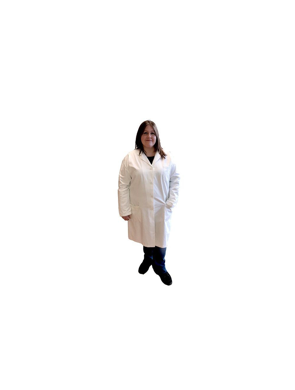 Knee-length lab coats made of easy care white cotton blend fabric (65% polyester, 35% cotton). Our coats feature one upper left breast pocket, two roomy lower pockets, side pocket slit openings, and a sewn-down back belt.